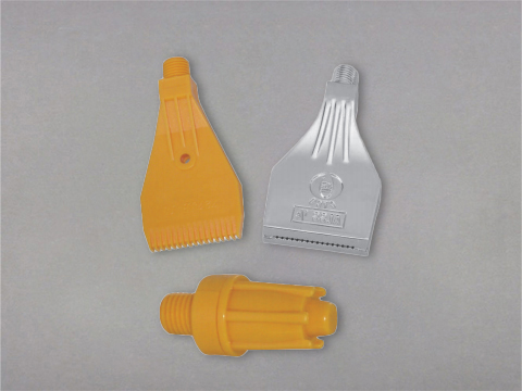 3、F型吹風(fēng)噴嘴適用于1/4英寸BSPT外螺紋連接頭,并設(shè)計(jì)有定位孔(ABS噴嘴),便于噴嘴的并排安裝;其形成的組合式風(fēng)刀能產(chǎn)生有效的空氣簾