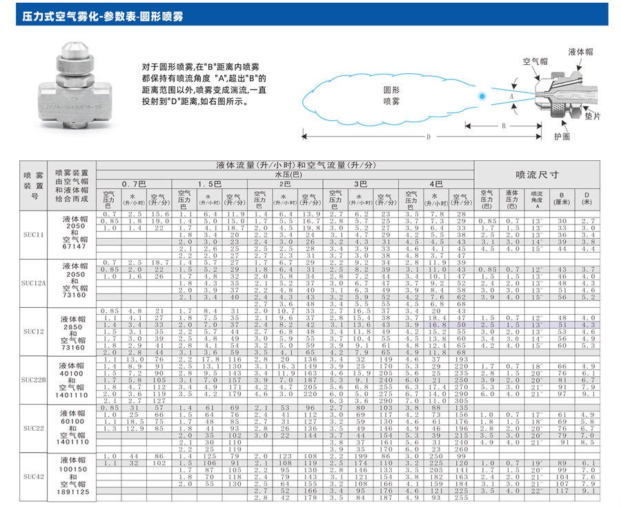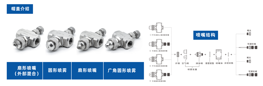 3、每一種噴霧裝置均由空氣帽和液體帽組成,噴嘴體的入口接頭有多種尺寸,以上噴嘴部件可以互換,適合大多數(shù)常用的管道